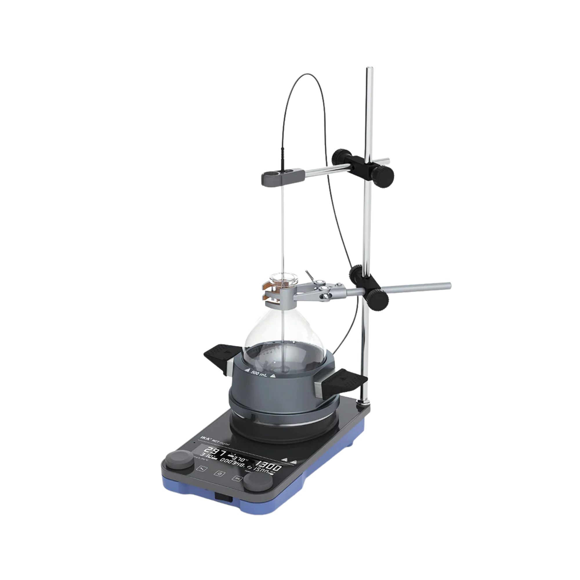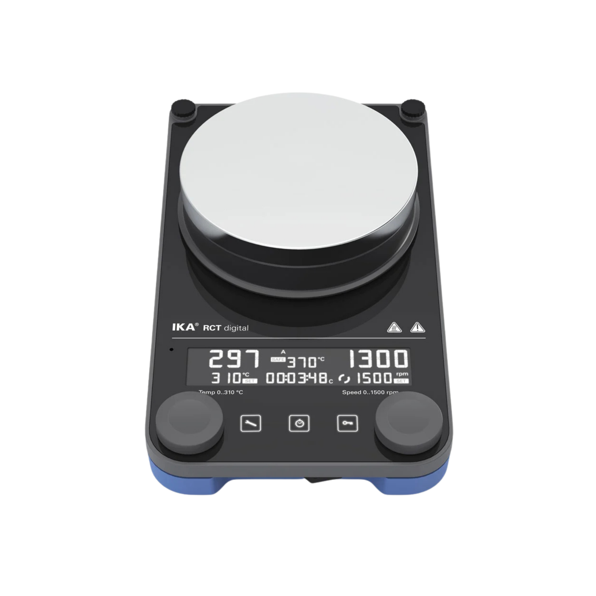Der RCT digital überzeugt durch eine hochpräzise Temperaturregelung, die direkt über das übersichtliche LCD-Display gesteuert wird. Dank des im Lieferumfang enthaltenen externen Temperaturfühlers PT 1000 kann die Mediumstemperatur mit höchster Genauigkeit überwacht und geregelt werden. Ein einstellbarer Sicherheitskreis für die Heizplattentemperatur sorgt zudem dafür, dass kritische Grenzwerte niemals überschritten werden. Die integrierte „Hot Top“-Anzeige warnt den Anwender vor heißen Oberflächen, selbst wenn das Gerät bereits ausgeschaltet ist, was die Arbeitssicherheit im Laboralltag massiv erhöht.