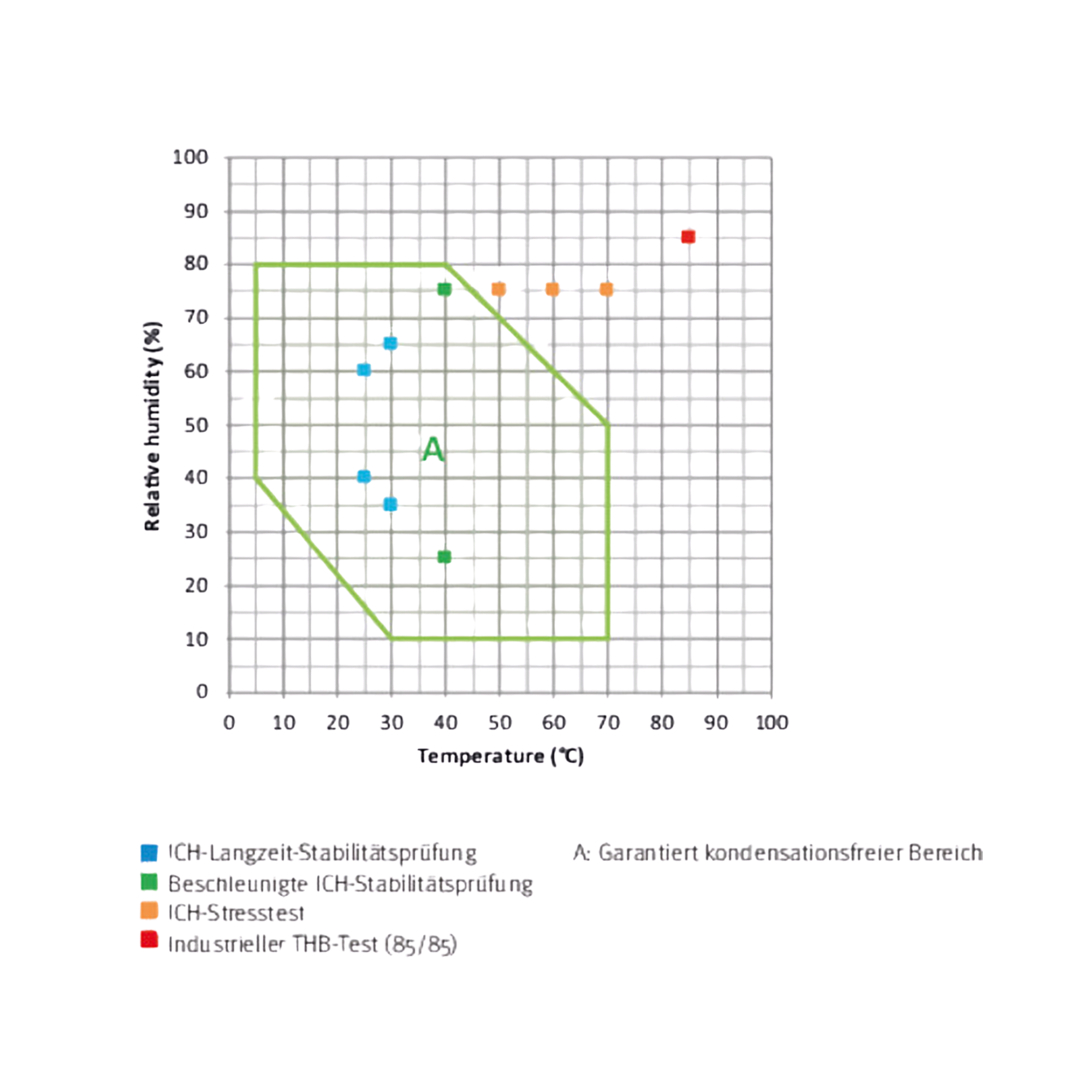 Die Befeuchtung erfolgt über einen reaktionsschnellen Dampfbefeuchter, der an die Wasserversorgung (oder einen Kanister) angeschlossen wird. Gemessen wird die Feuchte über einen kapazitiven Feuchtesensor, der driftfrei arbeitet und wartungsarm ist. Der Regelbereich reicht von 10 % r.F. bis 80 % r.F. bei Temperaturen von 0 °C bis +70 °C. Selbst nach Türöffnungen regelt das System blitzschnell nach, um die definierten Parameter wiederherzustellen.