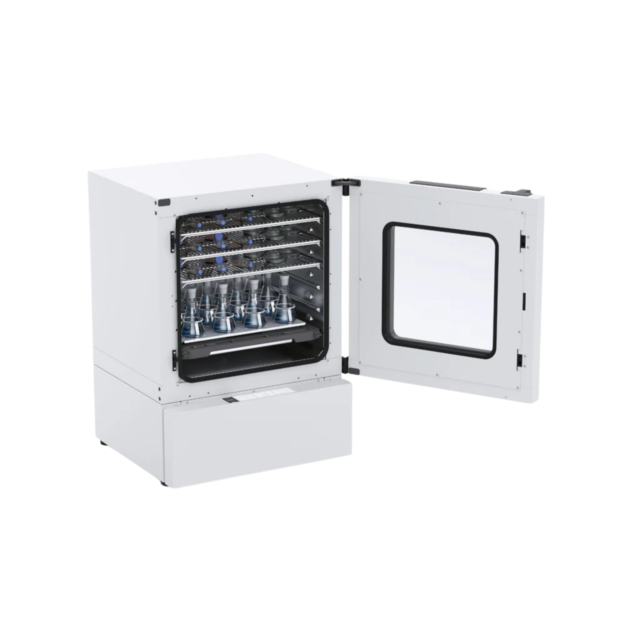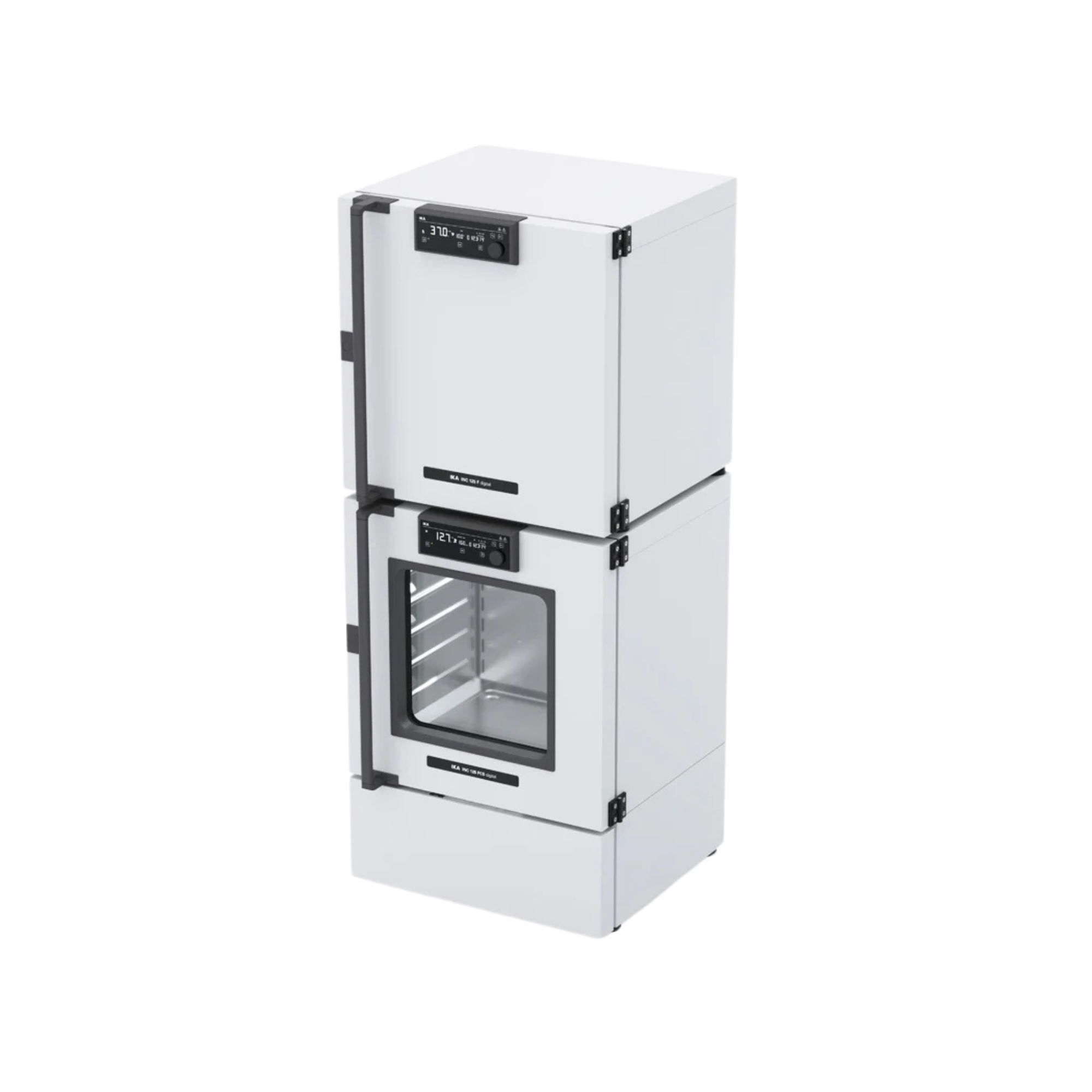 Die Kultivierung von thermolabilen Zellen oder mikrobiologischen Matrizes erfordert eine hochpräzise, kybernetisch geregelte Temperaturführung. Der IKA INC 125 FCS digital operiert mit einer leistungsstarken Kompressorkühltechnologie, die das thermodynamisch hocheffiziente, biogene Kältemittel R290 (Propan) nutzt. Das PID-Regelsystem moduliert die Heiz- und Kühlaggregate in Echtzeit, um das 125-Liter-Kammervolumen innerhalb eines Arbeitsbereiches von 5 °C bis 80 °C (bei aktiver Schüttelfunktion) absolut isotherm zu halten. Die integrierte Luftzirkulation (reversibel steuerbar von 40 bis 100 %) generiert eine konstante konvektive Strömung. Dies verhindert die Entstehung thermischer Schichtungen (Gradienten) im Innenraum und garantiert eine metrologische Temperaturhomogenität von ± 0,3 K über alle potenziellen Kultivierungsebenen.