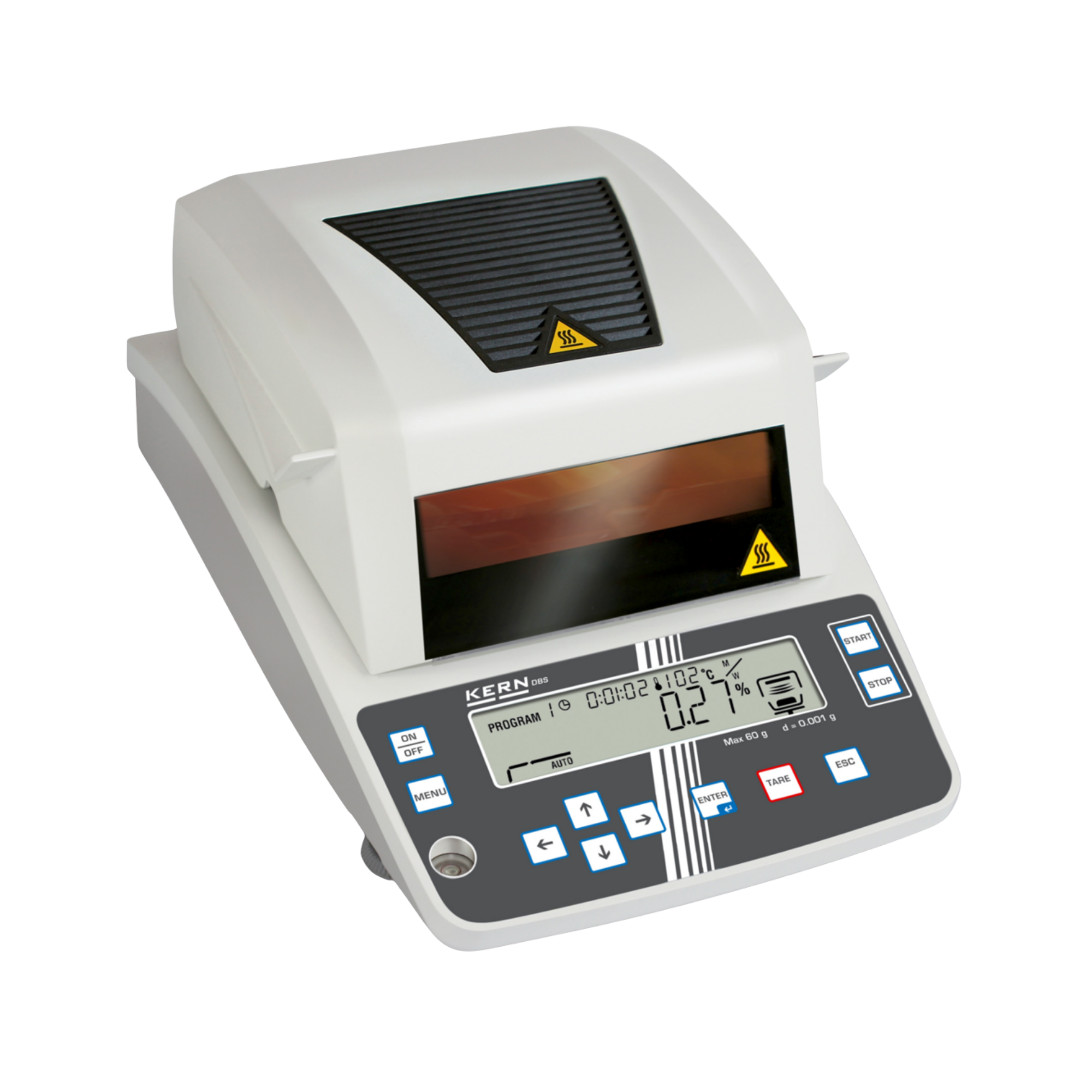 Die Leistungsfähigkeit des Heizsystems wird durch eine hochpräzise Wägezelle ergänzt. Der KERN DBS 60-3 bietet einen Wägebereich von bis zu 60 Gramm, was für die allermeisten Routineanwendungen in der Feuchteanalytik mehr als ausreichend dimensioniert ist. Der eigentliche Clou dieses Modells liegt jedoch in seiner überragenden Ablesbarkeit von 0,001 Gramm (was exakt einem Feuchtigkeitsgehalt von 0,01 % entspricht). Diese extrem feine Auflösung ist zwingend erforderlich, wenn Sie mit sehr wertvollen, teuren oder schwer zu beschaffenden Proben arbeiten und daher nur sehr kleine Einwaagen (beispielsweise 2 bis 5 Gramm) für Ihre Analyse verwenden können. Selbst bei diesen minimalen Probenmengen registriert die Waage zuverlässig den Bruchteil eines Milligramms an verdampftem Wasser und berechnet daraus ein mathematisch exaktes, verlässliches Feuchteprofil.