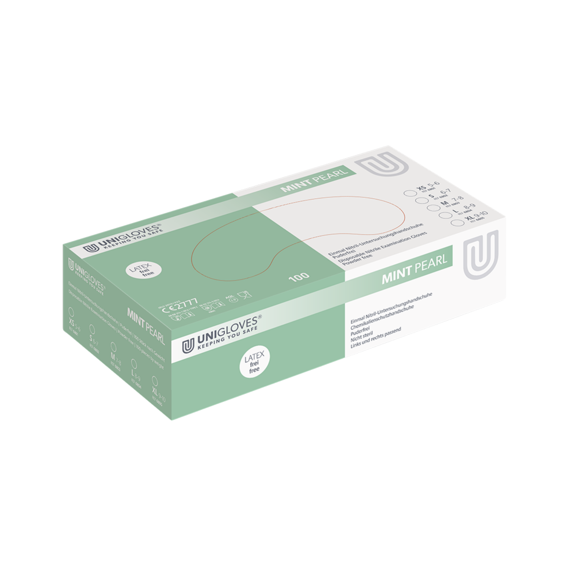 1 x Umkarton (VE) enthaltend 10 Spenderboxen à 100 Stück = Insgesamt 1.000 Stück Unigloves Mint Pearl Nitrilhandschuhe (Größe gemäß Auswahl)